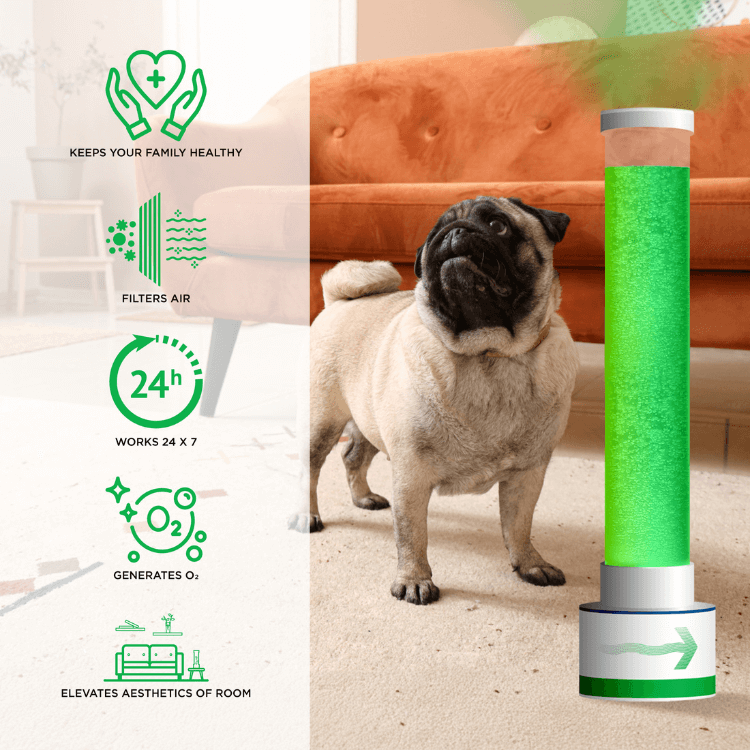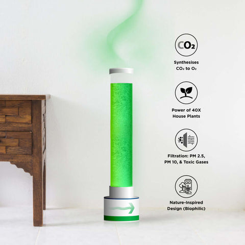 - Natural CO₂ Capture & Oxygen Release: Living microalgae transform indoor air by reducing CO₂, pollutants, and odors while generating fresh oxygen.